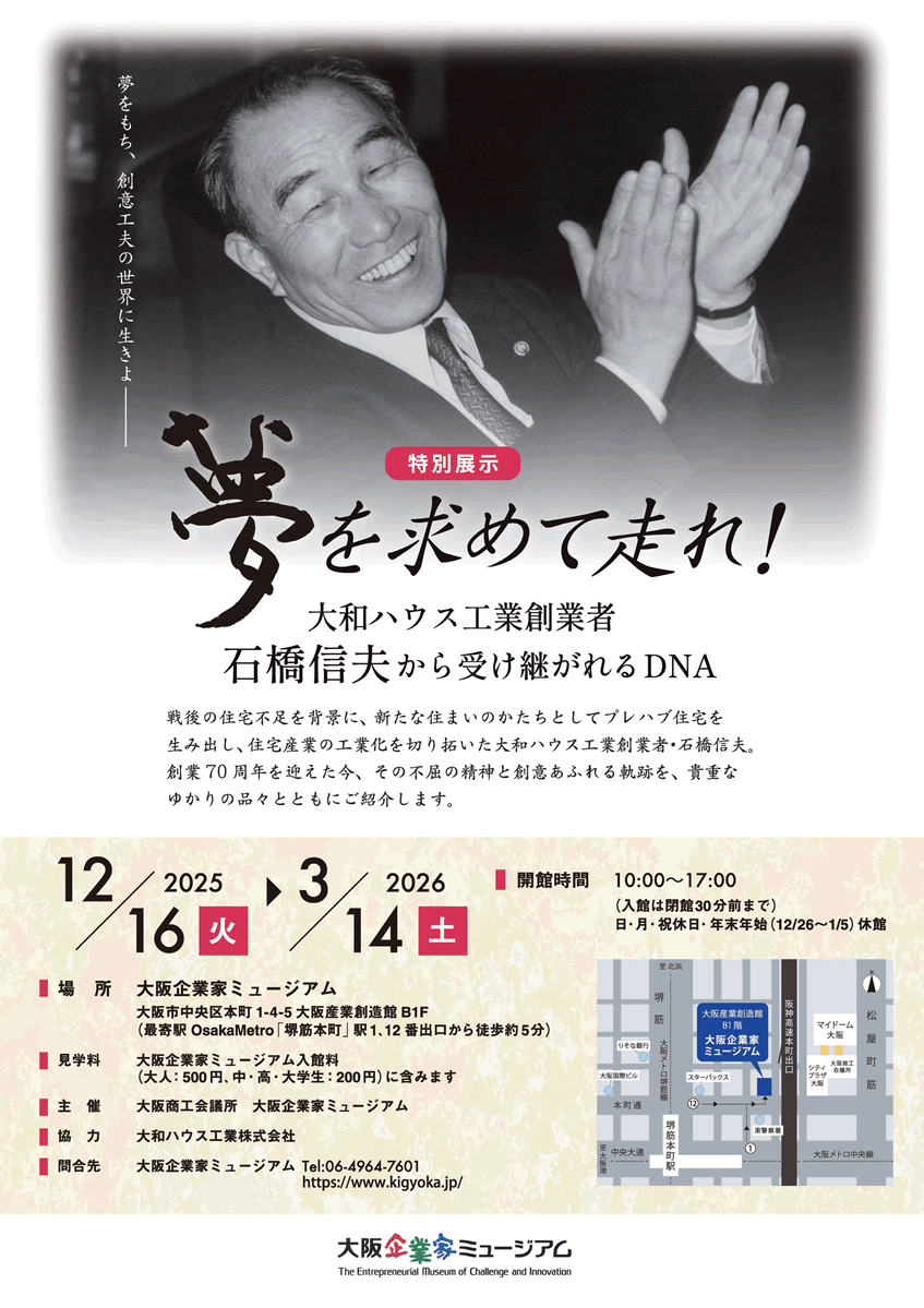 <Special Exhibition of Nobuo Ishibashi, Founder of Daiwa House Group> The Entrepreneurial Museum of Challenge and Innovation-Osaka (EMCI-OSAKA) will hold a special exhibition focusing on the indomitable life of Nobuo Ishibashi, the founder of Daiwa House Group, which is celebrating its 70th anniversary this year, and will widely introduce his achievements. ![]() ■Location: Entrepreneurial Museum of Challenge and Innovation -Osaka (EMCI-OSAKA) (B1, Business Innovation Center Osaka, 1-4-5 Honmachi, Chuo-ku, Osaka) ■Organizers: Osaka Chamber of Commerce and Industry, EMCI-OSAKA ■Supported by: Daiwa House Industry Co., Ltd. ■Opening Hours: 10:00 AM - 5:00 PM (Last entry at 4:30 PM) ■Closed: Sundays, Mondays, National Holidays, and the New Year's holiday period (December 26th (Friday) - January 5th (Monday)) ■ Admission fee: Included in the EMCI-OSAKA admission fee (¥500 per adult)